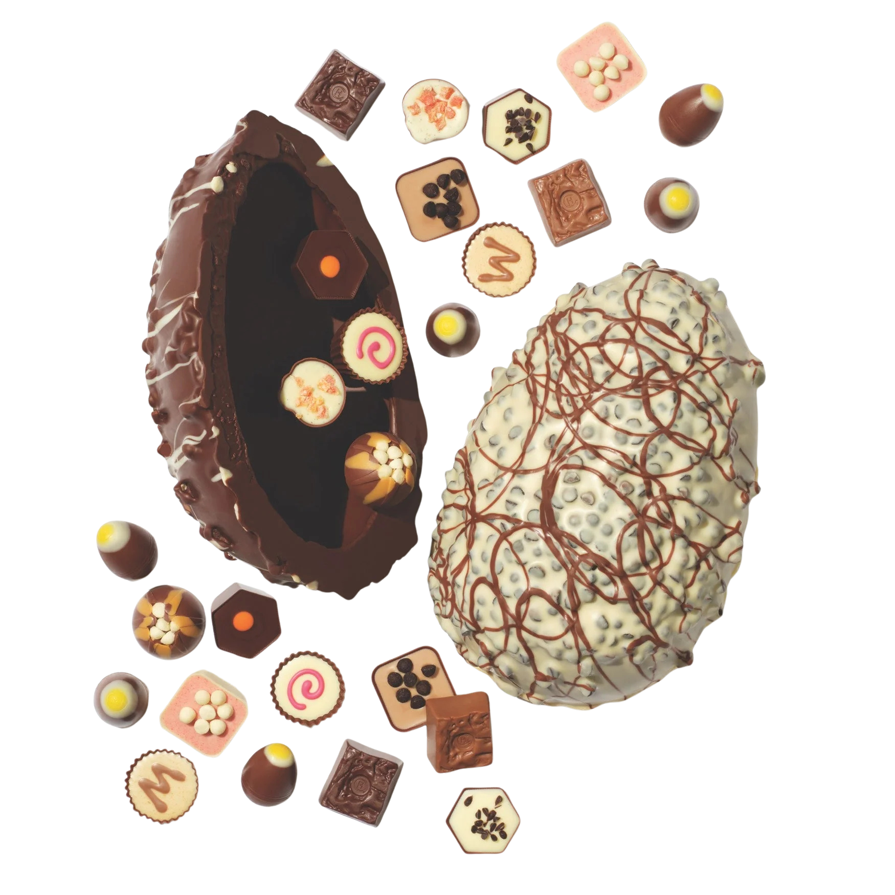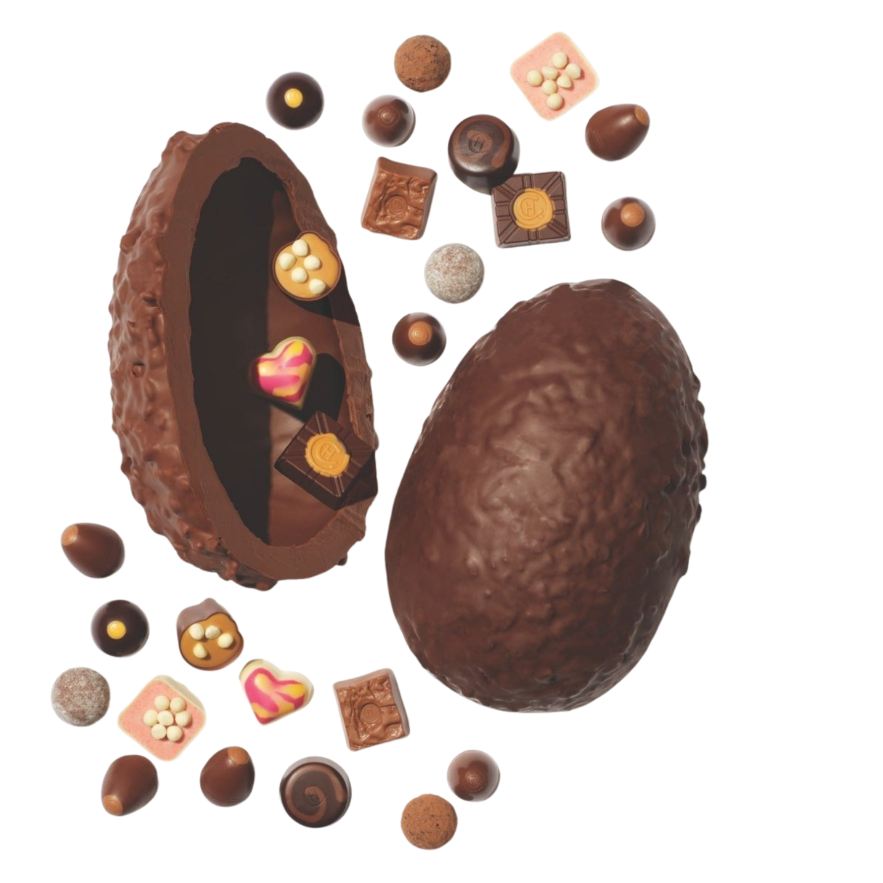 An extra-thick, snappable chocolate egg with layered milk–dark and hazelnut praline chocolate, filled with premium truffles, pralines, and soft caramels.
