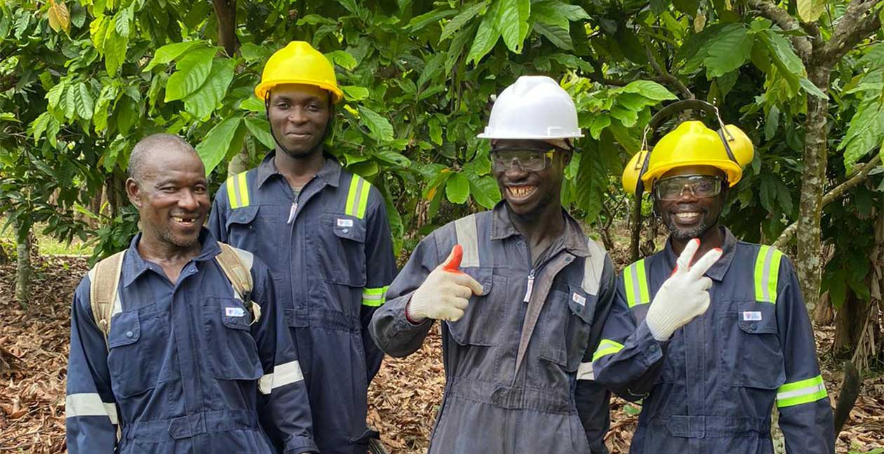 In 2021, we set up our Gentle Farming office in Nkawkaw, Eastern Ghana to support cocoa growers in the same way we have done in Saint Lucia and to encourage more sustainable growing practices. In exchange for above market rates for their cacao, we work with growers to reduce the environmental impact of their farming without reducing their yields.